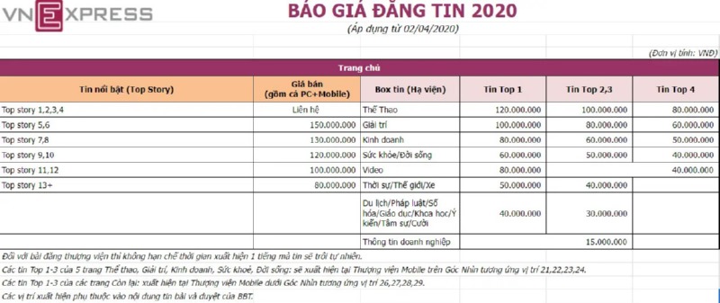 Báo giá VnExpress cho các bài viết thuộc mục tin tức nổi bật, nằm trên top nhanh chóng là: